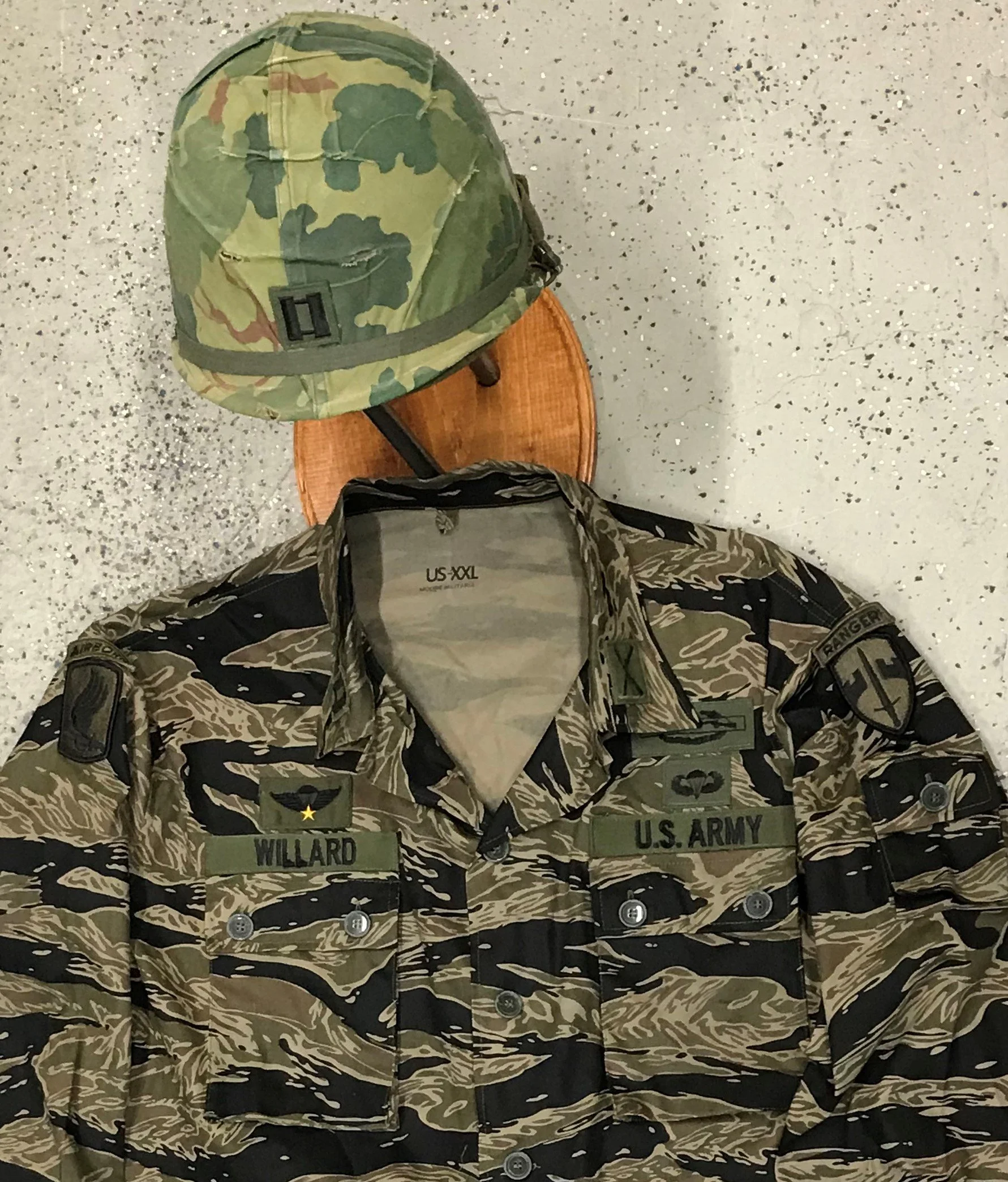 The early pattern helmet shows loss of wear that was organic prior to the prop artist’s paintwork. The Visor cover has actual metal insignia added to it. For all, we know the helmet may have been a rainy project, or even in the aftermath of the storm. The helmet in the show has decals of the silver oak leaf and crossed sabers, the surfboards look the same as the back of the helmet but may have been too much for an officer that is completely tracked. The helmet had been marked Duvall helmet, with / surf graphics. He wears the standard 3rd pattern jungle fatigues that use metal and cloth insignia applied to it, much as the one used in the film, though likely never used in the movie. The character of Killgore is a ‘high speed’, low drag’ officer who has been in and graduated from a number of military training schools including Airborne, Ranger, as well as aviation. He even has the Vietnamese ‘Airborne wings’ on the uniform, defiantly a groomed lifer. He has a prior tour and earned the Combat Infantryman’s Badge, and matching 3re pattern trousers to the jacket. He wore black Corcoran jump boots spit-shined to perfection, along with his black leather cavalry belt, with its gold buckle. He hears only the helmet and stetson hat in the film.